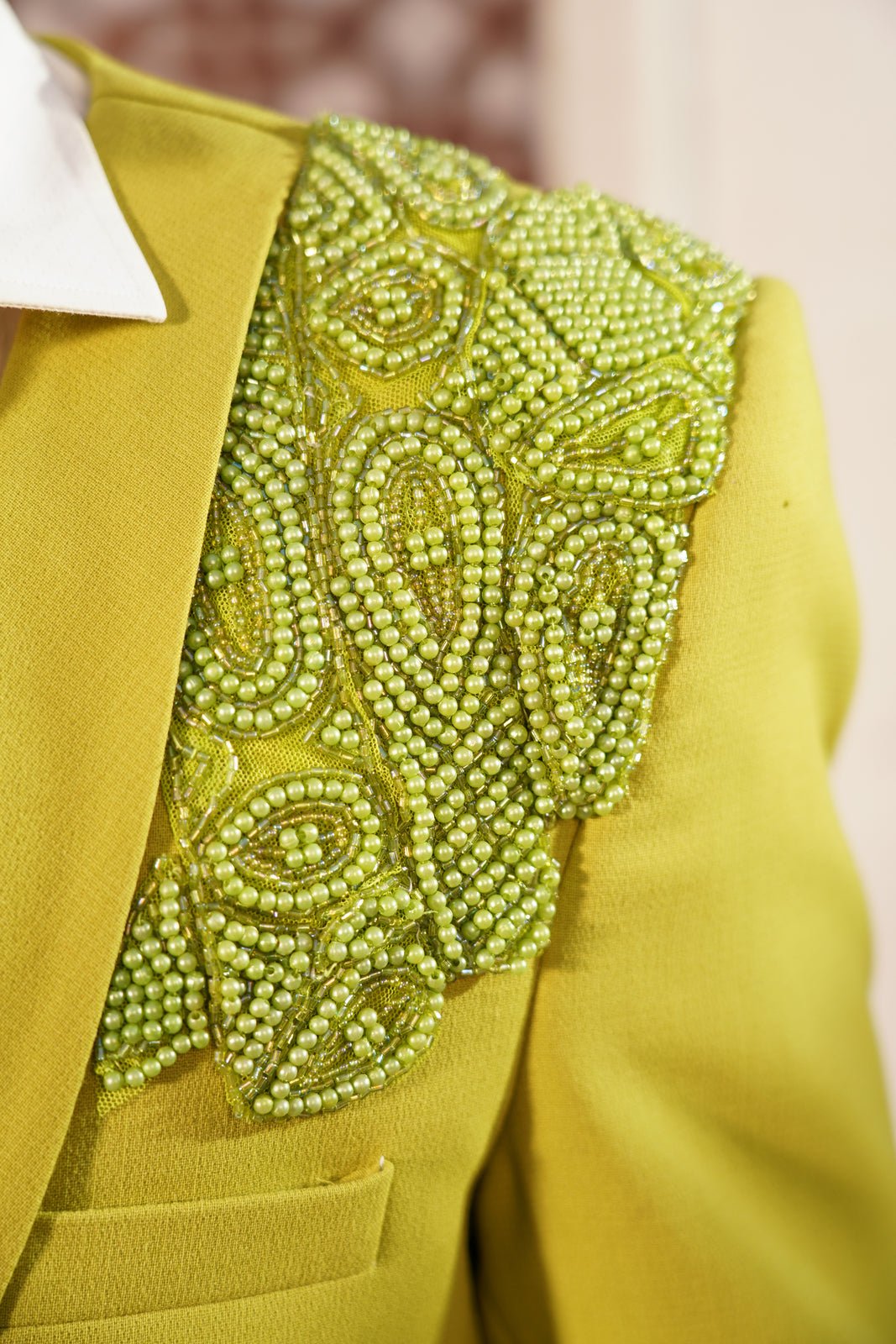 Statement left-shoulder embroidery in tone-on-tone thread